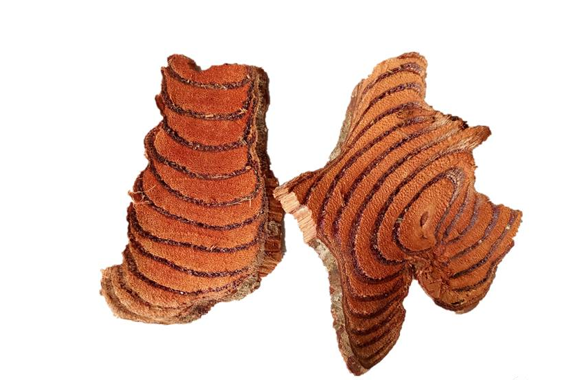 【性状】 本品为椭圆形、、、、长矩圆形或不规则的斜切片,,,厚0.3~1cm。。。栓皮灰棕色,,有的可见灰白色斑,,,,栓皮脱落处显红棕色。。。。质坚硬。。。切面木部红棕色或棕色,,,导管孔多数;韧皮部有树脂状分泌物呈红棕色至黑棕色,,与木部相间排列呈数个同心性椭圆形环或偏心性半圆形环;髓部偏向一侧。。。气微,,味涩。。