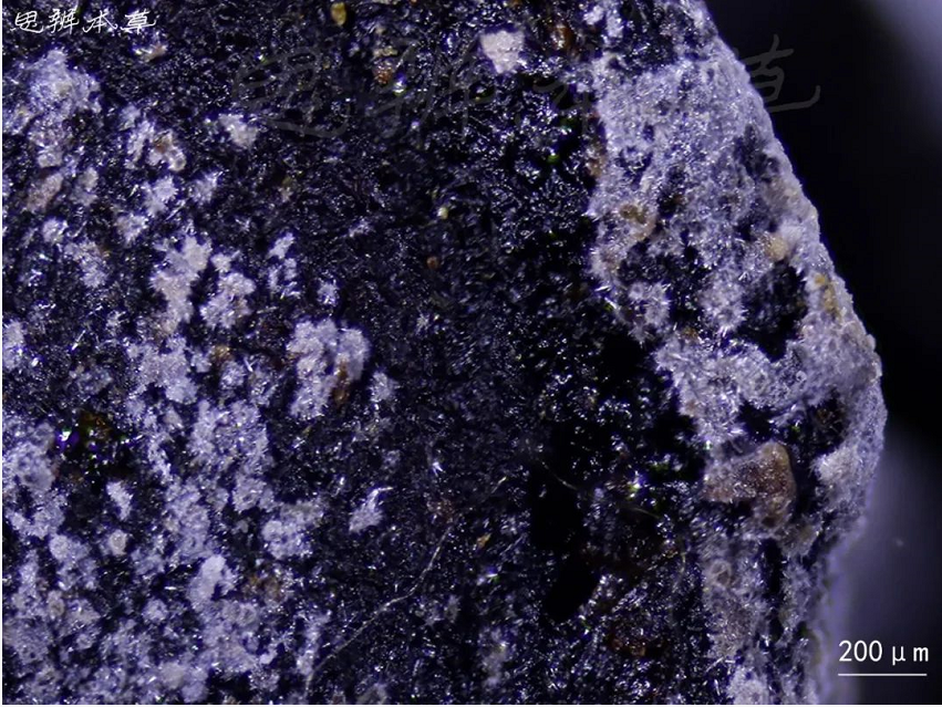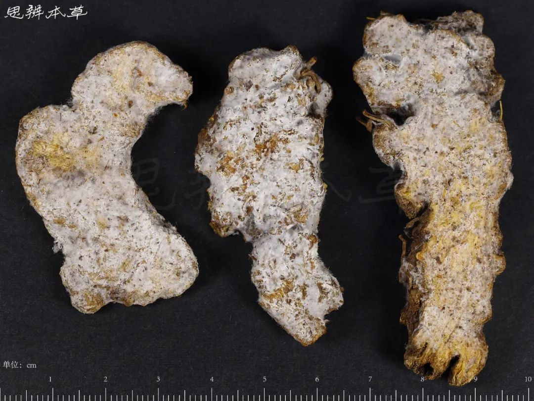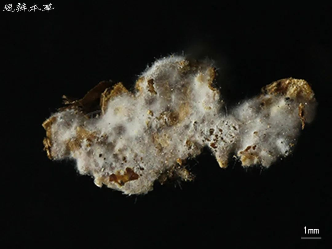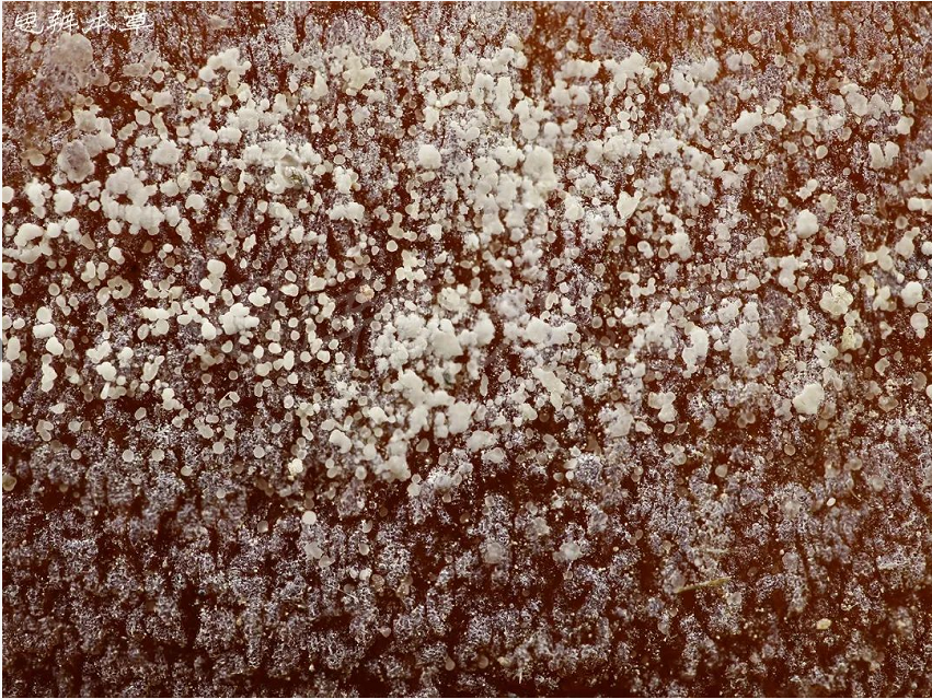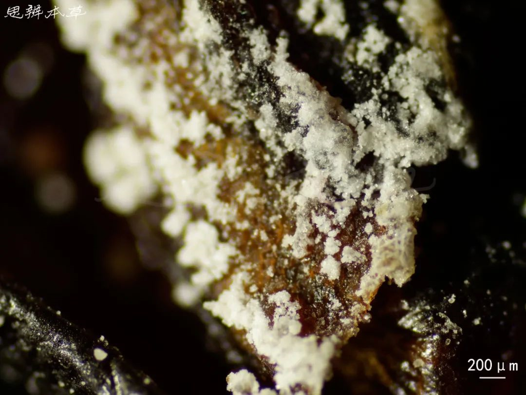 ▲五倍子内表面排泻物、、、粉霜及结晶图
