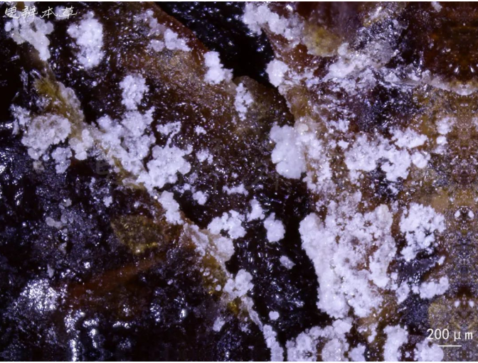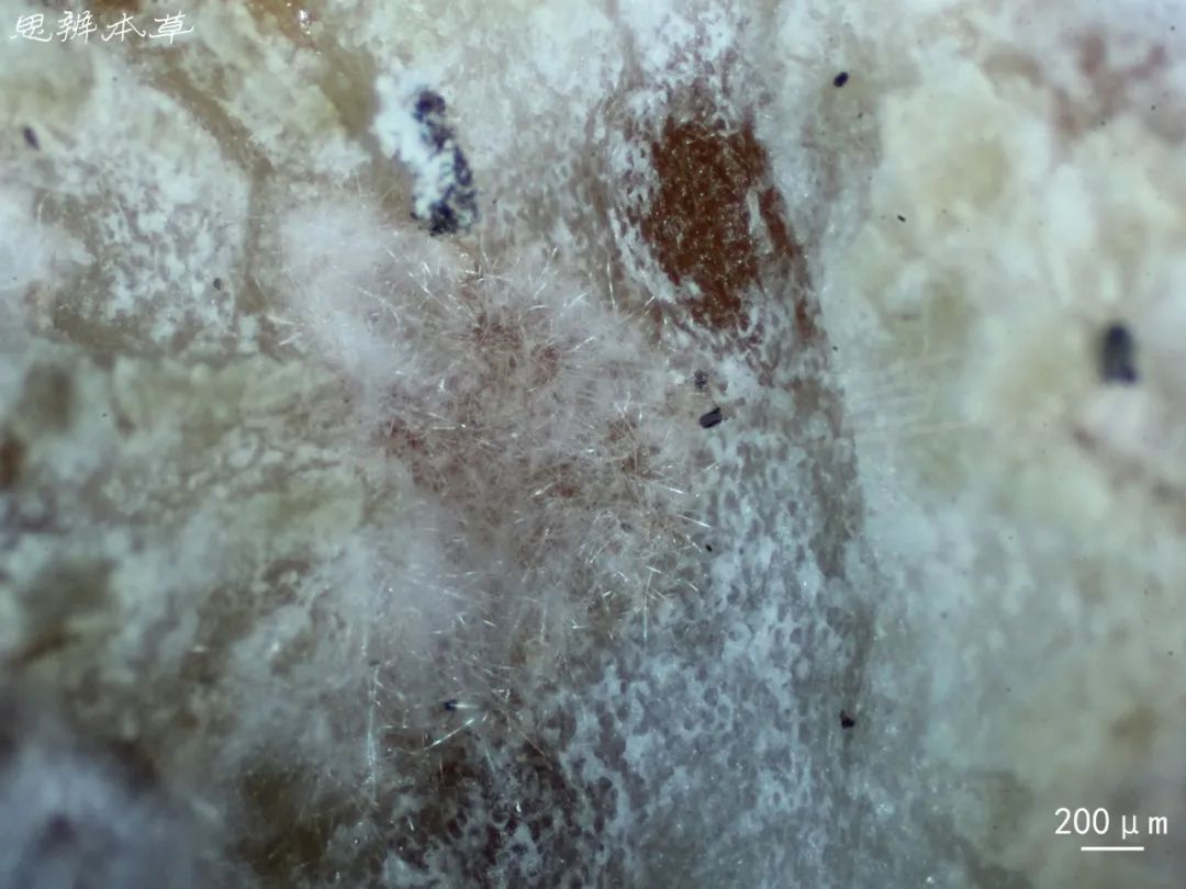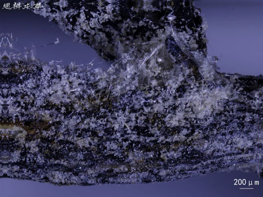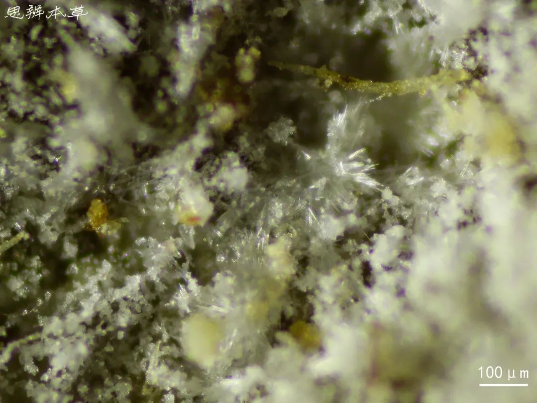 ▲海藻表面白霜(针状结晶)和盐霜(颗粒状盐结晶)图