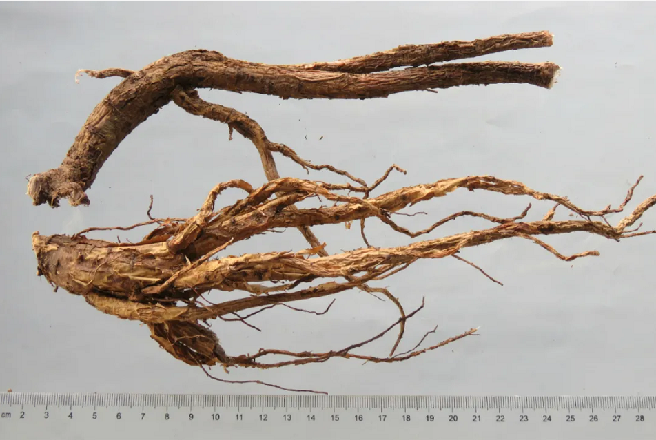 【性状】本品呈长圆柱形,,下部常有分枝,,长10~30cm,,直径1~6.5cm。。。表面灰棕色或棕黄色,,,,具纵皱纹和横长皮孔样突起,,,外皮薄,,多破裂反卷,,易剥落,,,,剥落处显黄色,,,光滑。。。。质硬,,,,不易折断,,,,断面纤维性;切片厚3~6mm;切面黄白色,,具放射状纹理和裂隙,,,,有的具异型维管束呈同心性环列或不规则散在。。气微,,,味极苦。。。