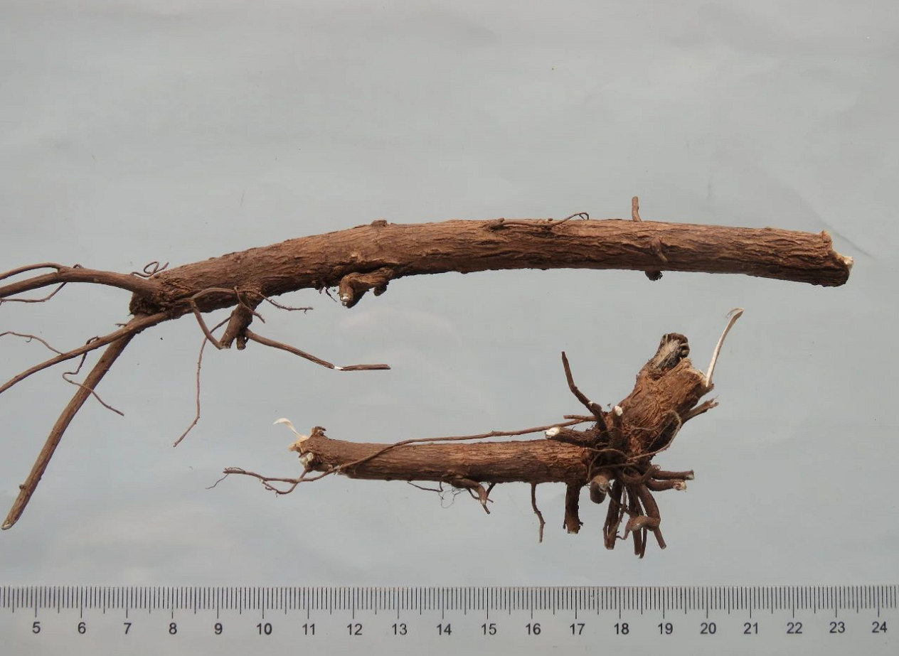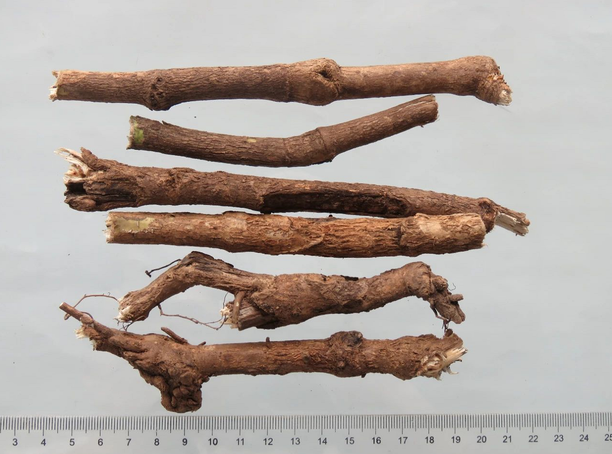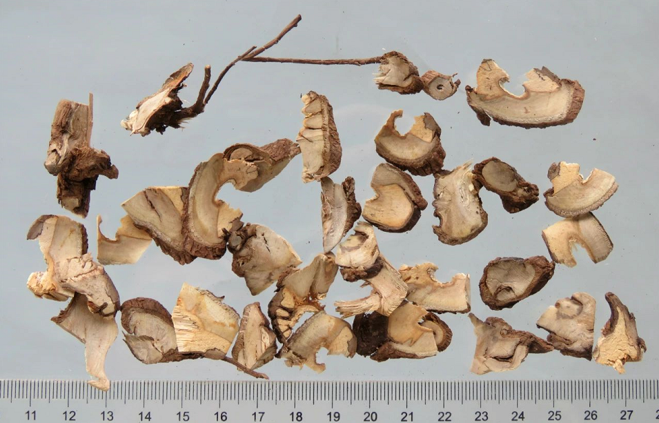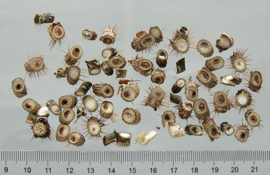 【性状】 本品呈类圆形或不规则形的厚片。。。根和根茎外表皮灰褐色或黑褐色,,,,粗糙,,,有细纵沟和皱纹,,,,皮较薄,,,有的剥落,,,,剥落处呈灰黄色;茎外表皮浅灰色或灰褐色,,,,无刺,,,幼枝黄褐色,,,密生细刺。。切面黄白色,,,,纤维性,,,茎的皮部薄,,,,木部宽广,,中心有髓。。。。根和根茎有特异香气,,,味微辛、、稍苦、、、、涩;茎气微,,,,味微辛。。。