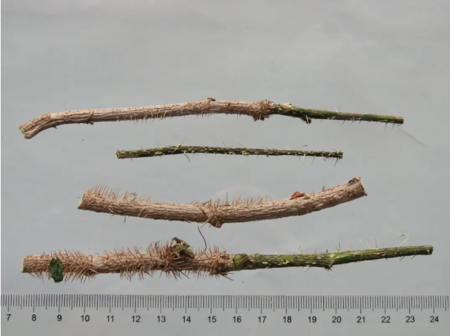 本品茎呈长圆柱形,,,,多分枝,,,,长短不一,,,直径0.5~2cm。。。表面浅灰色,,老枝灰褐色,,,具纵裂沟,,无刺;幼枝黄褐色,,密生细刺。。。质坚硬,,不易折断,,,,断面皮部薄,,,黄白色,,木部宽广,,,淡黄色,,中心有髓。。。。气微,,味微辛。。。。